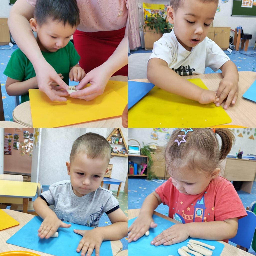 Мақсаты: Балаларды тұздалған қамырдан дөңгелек пішінді заттарды (баранки) мүсіндеуге үйрету, ұсақ моторикасын дамыту, мүсіндеуге қызығушылықты арттыру.